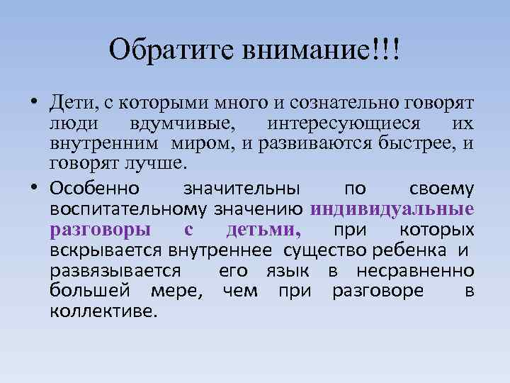 Обратите внимание!!! • Дети, с которыми много и сознательно говорят люди вдумчивые, интересующиеся их внутренним миром, и развиваются быстрее, и говорят лучше. • Особенно значительны по своему воспитательному значению индивидуальные разговоры с детьми, при которых вскрывается внутреннее существо ребенка и развязывается его язык в несравненно большей мере, чем при разговоре в коллективе.