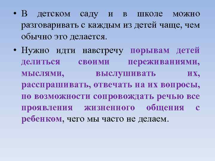 • В детском саду и в школе можно разговаривать с каждым из детей чаще, чем обычно это делается. • Нужно идти навстречу порывам детей делиться своими переживаниями, мыслями, выслушивать их, расспрашивать, отвечать на их вопросы, по возможности сопровождать речью все проявления жизненного общения с ребенком, чего мы часто не делаем.