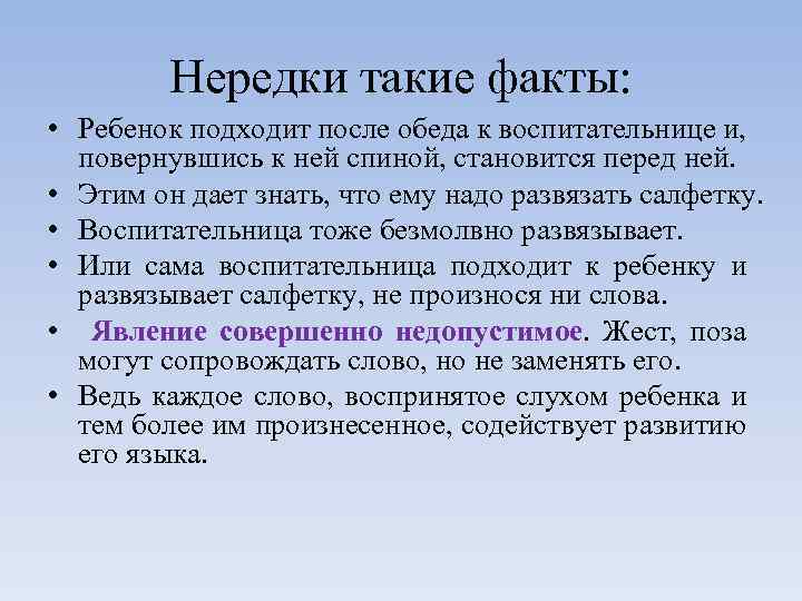 Нередки такие факты: • Ребенок подходит после обеда к воспитательнице и, повернувшись к ней спиной, становится перед ней. • Этим он дает знать, что ему надо развязать салфетку. • Воспитательница тоже безмолвно развязывает. • Или сама воспитательница подходит к ребенку и развязывает салфетку, не произнося ни слова. • Явление совершенно недопустимое. Жест, поза могут сопровождать слово, но не заменять его. • Ведь каждое слово, воспринятое слухом ребенка и тем более им произнесенное, содействует развитию его языка.
