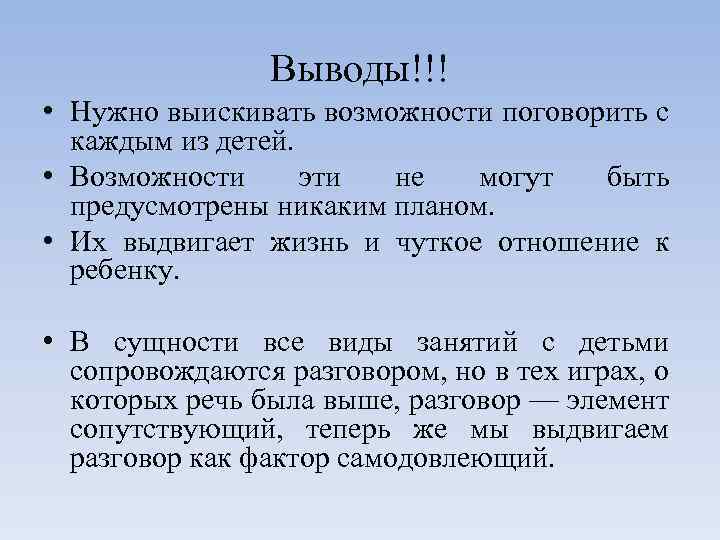 Выводы!!! • Нужно выискивать возможности поговорить с каждым из детей. • Возможности эти не могут быть предусмотрены никаким планом. • Их выдвигает жизнь и чуткое отношение к ребенку. • В сущности все виды занятий с детьми сопровождаются разговором, но в тех играх, о которых речь была выше, разговор — элемент сопутствующий, теперь же мы выдвигаем разговор как фактор самодовлеющий.
