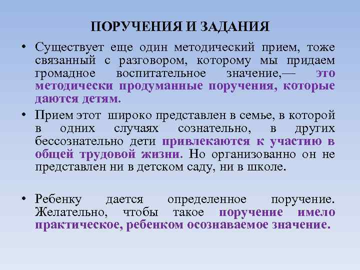 ПОРУЧЕНИЯ И ЗАДАНИЯ • Существует еще один методический прием, тоже связанный с разговором, которому мы придаем громадное воспитательное значение, — это методически продуманные поручения, которые даются детям. • Прием этот широко представлен в семье, в которой в одних случаях сознательно, в других бессознательно дети привлекаются к участию в общей трудовой жизни. Но организованно он не представлен ни в детском саду, ни в школе. • Ребенку дается определенное поручение. Желательно, чтобы такое поручение имело практическое, ребенком осознаваемое значение.