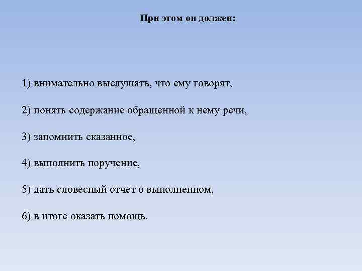 При этом он должен: 1) внимательно выслушать, что ему говорят, 2) понять содержание обращенной к нему речи, 3) запомнить сказанное, 4) выполнить поручение, 5) дать словесный отчет о выполненном, 6) в итоге оказать помощь.