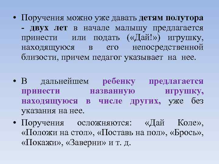 • Поручения можно уже давать детям полутора - двух лет в начале малышу предлагается принести или подать ( «Дай!» ) игрушку, находящуюся в его непосредственной близости, причем педагог указывает на нее. • В дальнейшем ребенку предлагается принести названную игрушку, находящуюся в числе других, уже без указания на нее. • Поручения осложняются: «Дай Коле» , «Положи на стол» , «Поставь на пол» , «Брось» , «Покажи» , «Заверни» и т. д.
