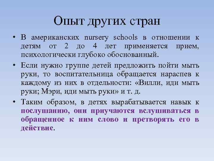 Опыт других стран • В американских nursery schools в отношении к детям от 2 до 4 лет применяется прием, психологически глубоко обоснованный. • Если нужно группе детей предложить пойти мыть руки, то воспитательница обращается нараспев к каждому из них в отдельности: «Вилли, иди мыть руки; Мэри, иди мыть руки» и т. д. • Таким образом, в детях вырабатывается навык к послушанию, они приучаются вслушиваться в обращенное к ним слово и претворять его в действие.