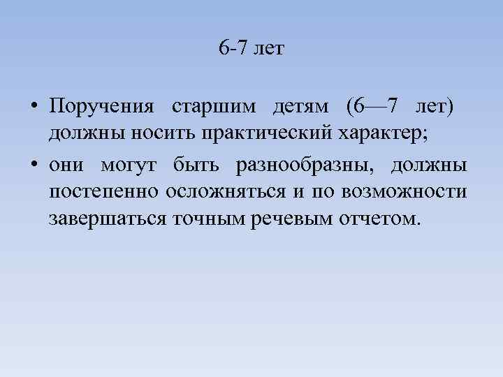 6 -7 лет • Поручения старшим детям (6— 7 лет) должны носить практический характер; • они могут быть разнообразны, должны постепенно осложняться и по возможности завершаться точным речевым отчетом.