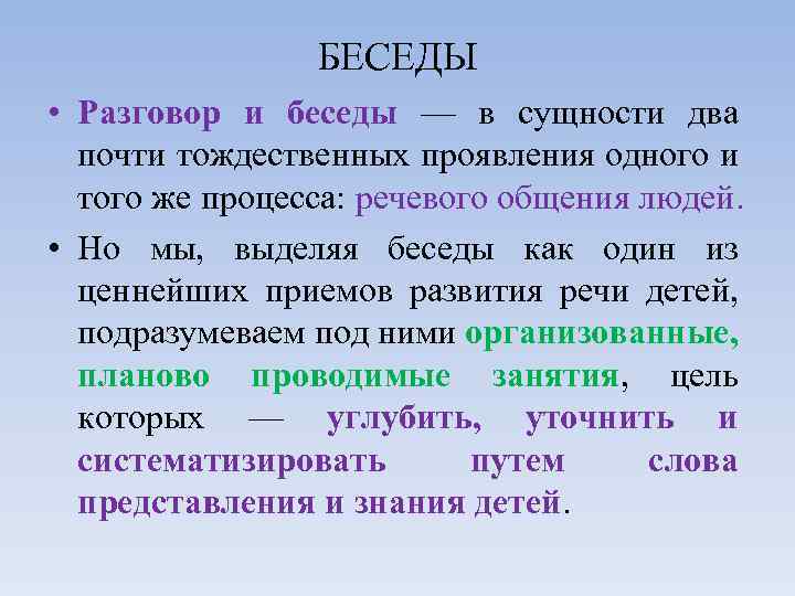 БЕСЕДЫ • Разговор и беседы — в сущности два почти тождественных проявления одного и того же процесса: речевого общения людей. • Но мы, выделяя беседы как один из ценнейших приемов развития речи детей, подразумеваем под ними организованные, планово проводимые занятия, цель которых — углубить, уточнить и систематизировать путем слова представления и знания детей.