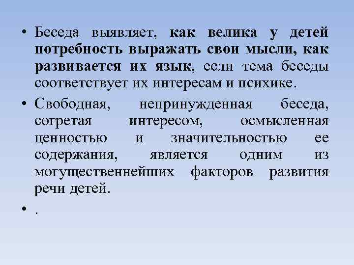 • Беседа выявляет, как велика у детей потребность выражать свои мысли, как развивается их язык, если тема беседы соответствует их интересам и психике. • Свободная, непринужденная беседа, согретая интересом, осмысленная ценностью и значительностью ее содержания, является одним из могущественнейших факторов развития речи детей. • .