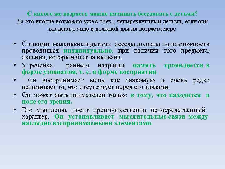 С какого же возраста можно начинать беседовать с детьми? Да это вполне возможно уже с трех-, четырехлетними детьми, если они владеют речью в должной для их возраста мере • С такими маленькими детьми беседы должны по возможности проводиться индивидуально, при наличии того предмета, явления, которым беседа вызвана. • У ребенка раннего возраста память проявляется в форме узнавания, т. е. в форме восприятия. • Он воспринимает вещь как знакомую и очень редко вспоминает то, что отсутствует перед его глазами. • Он может быть внимателен только к тому, что находится в поле его зрения. • Его мышление носит преимущественно непосредственный характер. Он устанавливает мыслительные связи между наглядно воспринимаемыми элементами.