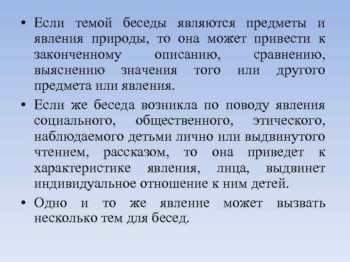 • Если темой беседы являются предметы и явления природы, то она может привести к законченному описанию, сравнению, выяснению значения того или другого предмета или явления. • Если же беседа возникла по поводу явления социального, общественного, этического, наблюдаемого детьми лично или выдвинутого чтением, рассказом, то она приведет к характеристике явления, лица, выдвинет индивидуальное отношение к ним детей. • Одно и то же явление может вызвать несколько тем для бесед.