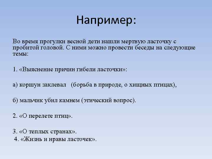Например: Во время прогулки весной дети нашли мертвую ласточку с пробитой головой. С ними можно провести беседы на следующие темы: 1. «Выяснение причин гибели ласточки» : а) коршун заклевал (борьба в природе, о хищных птицах), б) мальчик убил камнем (этический вопрос). 2. «О перелете птиц» . 3. «О теплых странах» . 4. «Жизнь и нравы ласточек» .
