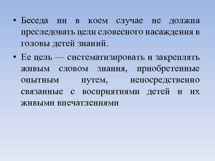 • Беседа ни в коем случае не должна преследовать цели словесного насаждения в головы детей знаний. • Ее цель — систематизировать и закреплять живым словом знания, приобретенные опытным путем, непосредственно связанные с восприятиями детей и их живыми впечатлениями
