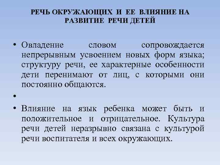 РЕЧЬ ОКРУЖАЮЩИХ И ЕЕ ВЛИЯНИЕ НА РАЗВИТИЕ РЕЧИ ДЕТЕЙ • Овладение словом сопровождается непрерывным усвоением новых форм языка; структуру речи, ее характерные особенности дети перенимают от лиц, с которыми они постоянно общаются. • • Влияние на язык ребенка может быть и положительное и отрицательное. Культура речи детей неразрывно связана с культурой речи воспитателя и всех окружающих.