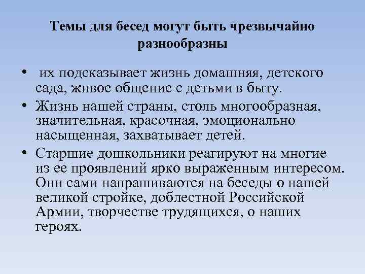 Темы для бесед могут быть чрезвычайно разнообразны • их подсказывает жизнь домашняя, детского сада, живое общение с детьми в быту. • Жизнь нашей страны, столь многообразная, значительная, красочная, эмоционально насыщенная, захватывает детей. • Старшие дошкольники реагируют на многие из ее проявлений ярко выраженным интересом. Они сами напрашиваются на беседы о нашей великой стройке, доблестной Российской Армии, творчестве трудящихся, о наших героях.