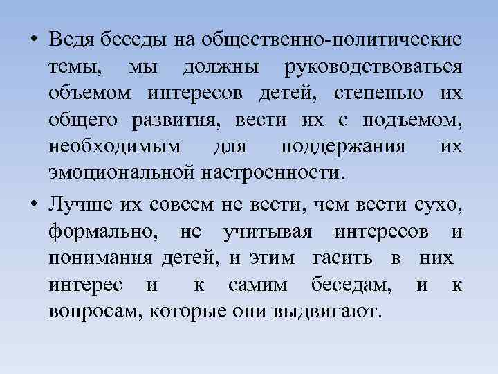 • Ведя беседы на общественно-политические темы, мы должны руководствоваться объемом интересов детей, степенью их общего развития, вести их с подъемом, необходимым для поддержания их эмоциональной настроенности. • Лучше их совсем не вести, чем вести сухо, формально, не учитывая интересов и понимания детей, и этим гасить в них интерес и к самим беседам, и к вопросам, которые они выдвигают.