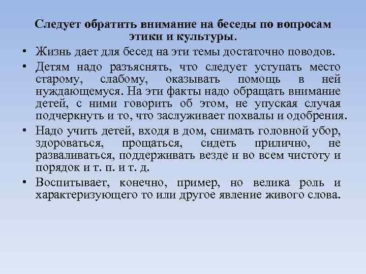 • • Следует обратить внимание на беседы по вопросам этики и культуры. Жизнь дает для бесед на эти темы достаточно поводов. Детям надо разъяснять, что следует уступать место старому, слабому, оказывать помощь в ней нуждающемуся. На эти факты надо обращать внимание детей, с ними говорить об этом, не упуская случая подчеркнуть и то, что заслуживает похвалы и одобрения. Надо учить детей, входя в дом, снимать головной убор, здороваться, прощаться, сидеть прилично, не разваливаться, поддерживать везде и во всем чистоту и порядок и т. п. и т. д. Воспитывает, конечно, пример, но велика роль и характеризующего то или другое явление живого слова.