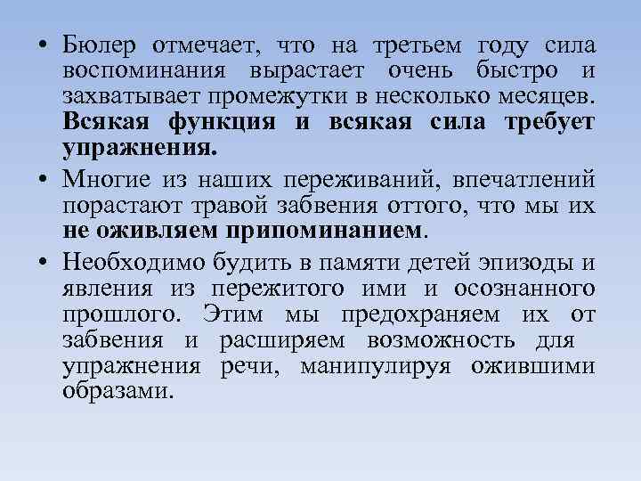 • Бюлер отмечает, что на третьем году сила воспоминания вырастает очень быстро и захватывает промежутки в несколько месяцев. Всякая функция и всякая сила требует упражнения. • Многие из наших переживаний, впечатлений порастают травой забвения оттого, что мы их не оживляем припоминанием. • Необходимо будить в памяти детей эпизоды и явления из пережитого ими и осознанного прошлого. Этим мы предохраняем их от забвения и расширяем возможность для упражнения речи, манипулируя ожившими образами.