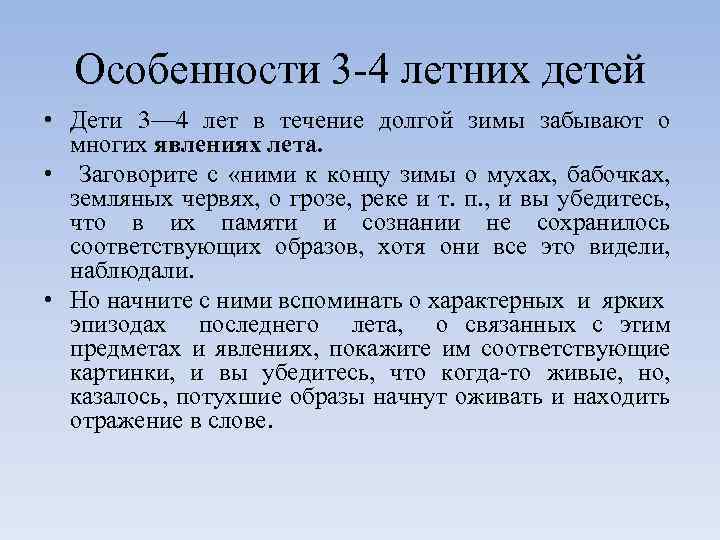 Особенности 3 -4 летних детей • Дети 3— 4 лет в течение долгой зимы забывают о многих явлениях лета. • Заговорите с «ними к концу зимы о мухах, бабочках, земляных червях, о грозе, реке и т. п. , и вы убедитесь, что в их памяти и сознании не сохранилось соответствующих образов, хотя они все это видели, наблюдали. • Но начните с ними вспоминать о характерных и ярких эпизодах последнего лета, о связанных с этим предметах и явлениях, покажите им соответствующие картинки, и вы убедитесь, что когда-то живые, но, казалось, потухшие образы начнут оживать и находить отражение в слове.