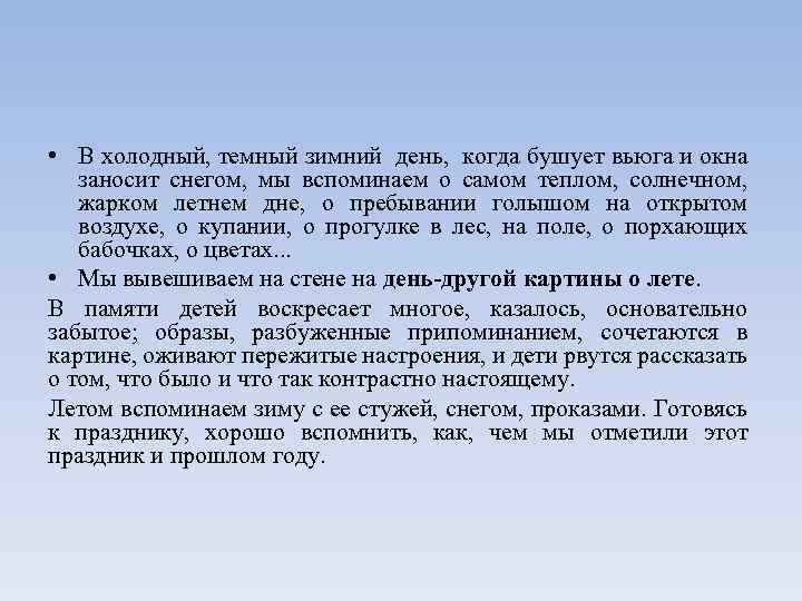 • В холодный, темный зимний день, когда бушует вьюга и окна заносит снегом, мы вспоминаем о самом теплом, солнечном, жарком летнем дне, о пребывании голышом на открытом воздухе, о купании, о прогулке в лес, на поле, о порхающих бабочках, о цветах. . . • Мы вывешиваем на стене на день-другой картины о лете. В памяти детей воскресает многое, казалось, основательно забытое; образы, разбуженные припоминанием, сочетаются в картине, оживают пережитые настроения, и дети рвутся рассказать о том, что было и что так контрастно настоящему. Летом вспоминаем зиму с ее стужей, снегом, проказами. Готовясь к празднику, хорошо вспомнить, как, чем мы отметили этот праздник и прошлом году.