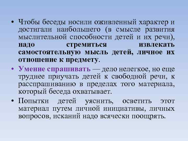 • Чтобы беседы носили оживленный характер и достигали наибольшего (в смысле развития мыслительной способности детей и их речи), надо стремиться извлекать самостоятельную мысль детей, личное их отношение к предмету. • Умение спрашивать — дело нелегкое, но еще труднее приучать детей к свободной речи, к расспрашиванию в пределах того материала, который беседа охватывает. • Попытки детей уяснить, осветить этот материал путем личной инициативы, личных вопросов, исканий надо всячески поощрять.