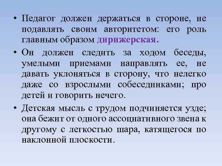 • Педагог должен держаться в стороне, не подавлять своим авторитетом: его роль главным образом дирижерская. • Он должен следить за ходом беседы, умелыми приемами направлять ее, не давать уклоняться в сторону, что нелегко даже со взрослыми собеседниками; про детей и говорить нечего. • Детская мысль с трудом подчиняется узде; она бежит от одного ассоциативного звена к другому с легкостью шара, катящегося по наклонной плоскости.