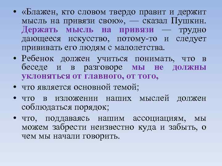 • «Блажен, кто словом твердо правит и держит мысль на привязи свою» , — сказал Пушкин. Держать мысль на привязи — трудно дающееся искусство, потому-то и следует прививать его людям с малолетства. • Ребенок должен учиться понимать, что в беседе и в разговоре мы не должны уклоняться от главного, от того, • что является основной темой; • что в изложении наших мыслей должен соблюдаться порядок; • что, поддаваясь нашим ассоциациям, мы можем забрести неизвестно куда и забыть, о чем мы начали говорить.