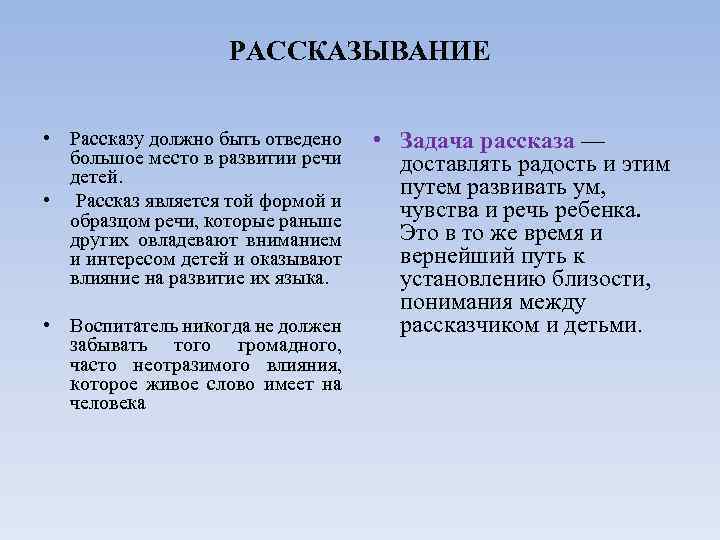 РАССКАЗЫВАНИЕ • Рассказу должно быть отведено большое место в развитии речи детей. • Рассказ является той формой и образцом речи, которые раньше других овладевают вниманием и интересом детей и оказывают влияние на развитие их языка. • Воспитатель никогда не должен забывать того громадного, часто неотразимого влияния, которое живое слово имеет на человека • Задача рассказа — доставлять радость и этим путем развивать ум, чувства и речь ребенка. Это в то же время и вернейший путь к установлению близости, понимания между рассказчиком и детьми.