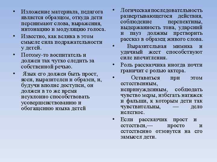 • Изложение материала, педагога является образцом, откуда дети перенимают слова, выражения, интонацию и модуляцию голоса. • Известно, как велика в этом смысле сила подражательности у детей. • Потому-то воспитатель и должен так чутко следить за собственной речью. • Язык его должен быть прост, ясен, выразителен и образен, и, будучи вполне доступен, он должен в то же время неуклонно способствовать усовершенствованию и обогащению языка детей • Логическая последовательность развертывающегося действия, соблюдение перспективы, выдержанность тона, ударений и пауз должны претворить рассказ в образец живого слова. • Выразительная мимика и удачный жест способствуют силе впечатления. • Роль рассказчика иногда почти граничит с ролью актера. • Оставаться при этом естественным, непринужденным, соблюдать чувство меры, избегать натяжек и фальши, к которым дети так чувствительны, — дело нелегкое. • Если рассказчик прост и естествен, — просто и естественно отзовутся на его замысел дети.
