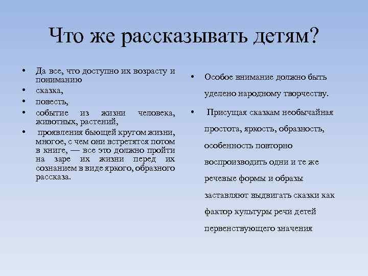 Что же рассказывать детям? • • • Да все, что доступно их возрасту и пониманию сказка, повесть, событие из жизни человека, животных, растений, проявления бьющей кругом жизни, многое, с чем они встретятся потом в книге, — все это должно пройти на заре их жизни перед их сознанием в виде яркого, образного рассказа. • Особое внимание должно быть уделено народному творчеству. • Присущая сказкам необычайная простота, яркость, образность, особенность повторно воспроизводить одни и те же речевые формы и образы заставляют выдвигать сказки как фактор культуры речи детей первенствующего значения