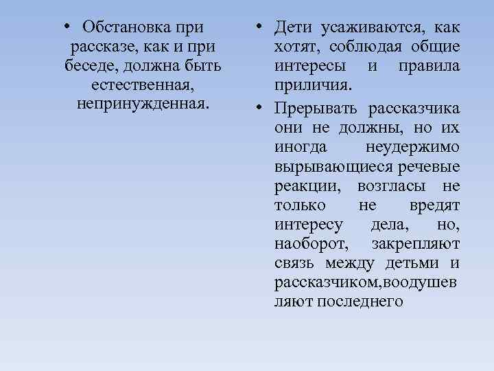 • Обстановка при рассказе, как и при беседе, должна быть естественная, непринужденная. • Дети усаживаются, как хотят, соблюдая общие интересы и правила приличия. • Прерывать рассказчика они не должны, но их иногда неудержимо вырывающиеся речевые реакции, возгласы не только не вредят интересу дела, но, наоборот, закрепляют связь между детьми и рассказчиком, воодушев ляют последнего
