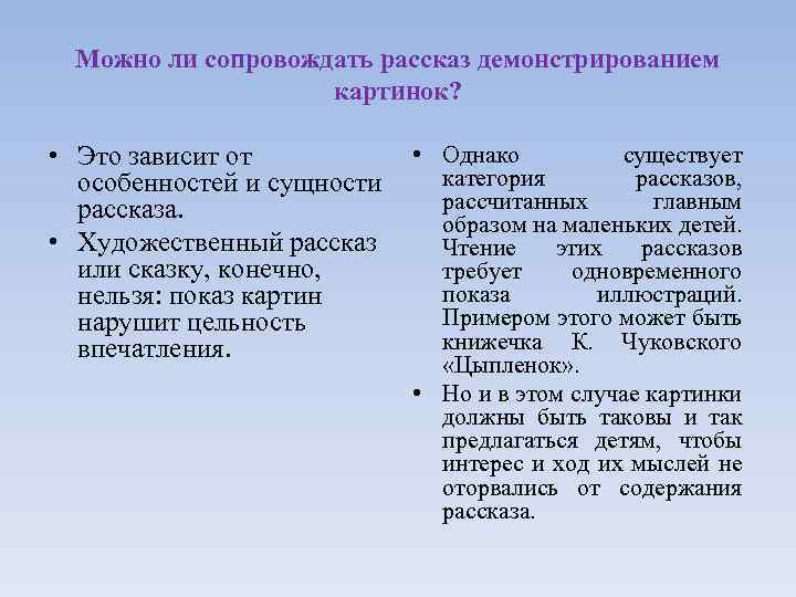 Можно ли сопровождать рассказ демонстрированием картинок? • Однако существует • Это зависит от категория рассказов, особенностей и сущности рассчитанных главным рассказа. образом на маленьких детей. • Художественный рассказ Чтение этих рассказов или сказку, конечно, требует одновременного показа иллюстраций. нельзя: показ картин Примером этого может быть нарушит цельность книжечка К. Чуковского впечатления. «Цыпленок» . • Но и в этом случае картинки должны быть таковы и так предлагаться детям, чтобы интерес и ход их мыслей не оторвались от содержания рассказа.
