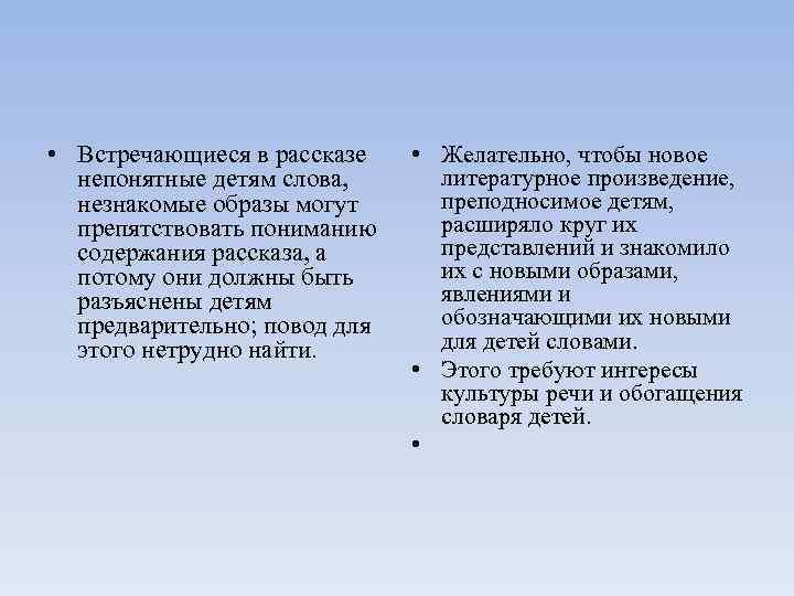 • Встречающиеся в рассказе непонятные детям слова, незнакомые образы могут препятствовать пониманию содержания рассказа, а потому они должны быть разъяснены детям предварительно; повод для этого нетрудно найти. • Желательно, чтобы новое литературное произведение, преподносимое детям, расширяло круг их представлений и знакомило их с новыми образами, явлениями и обозначающими их новыми для детей словами. • Этого требуют интересы культуры речи и обогащения словаря детей. •