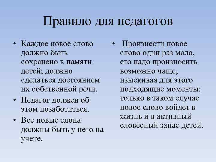 Правило для педагогов • Каждое новое слово • Произнести новое должно быть слово один раз мало, сохранено в памяти его надо произносить детей; должно возможно чаще, сделаться достоянием изыскивая для этого их собственной речи. подходящие моменты: только в таком случае • Педагог должен об новое слово войдет в этом позаботиться. жизнь и в активный • Все новые слона словесный запас детей. должны быть у него на учете.