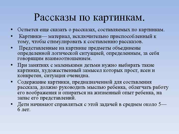 • Рассказывание детям по картинкам — один из наиболее целесообразных приемов по слушанию речи. Чем чаще мы будем рассказывать малышам по картинкам, тем раньше они встанут на путь составления рассказов сами. • На всех ступенях рассказам детей должен предшествовать образцовый рассказ педагога. • На примере таких рассказов дети постигают, что рассказчик может вообразить себе моменты, предшествующие тому, который представлен на картинке, и последующий за ним может выйти за рамки картинки.