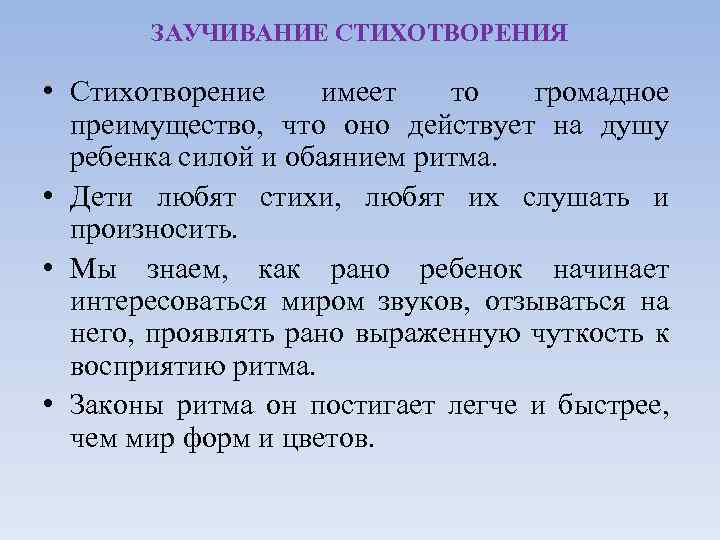 ЗАУЧИВАНИЕ СТИХОТВОРЕНИЯ • Стихотворение имеет то громадное преимущество, что оно действует на душу ребенка силой и обаянием ритма. • Дети любят стихи, любят их слушать и произносить. • Мы знаем, как рано ребенок начинает интересоваться миром звуков, отзываться на него, проявлять рано выраженную чуткость к восприятию ритма. • Законы ритма он постигает легче и быстрее, чем мир форм и цветов.
