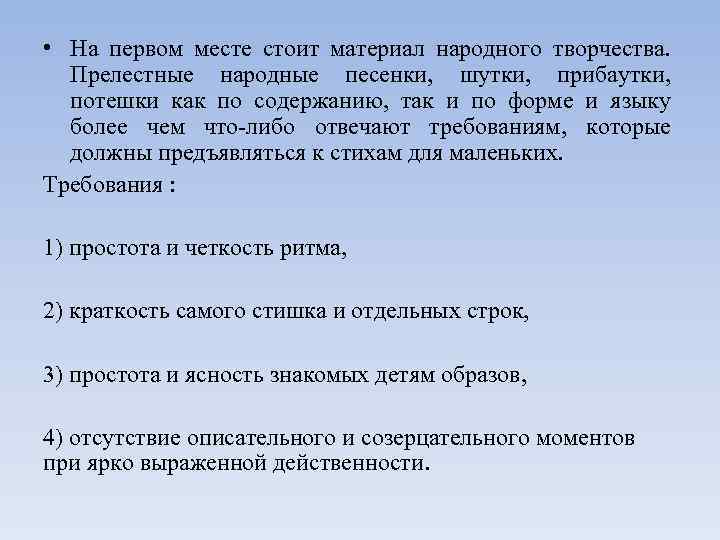 • На первом месте стоит материал народного творчества. Прелестные народные песенки, шутки, прибаутки, потешки как по содержанию, так и по форме и языку более чем что-либо отвечают требованиям, которые должны предъявляться к стихам для маленьких. Требования : 1) простота и четкость ритма, 2) краткость самого стишка и отдельных строк, 3) простота и ясность знакомых детям образов, 4) отсутствие описательного и созерцательного моментов при ярко выраженной действенности.
