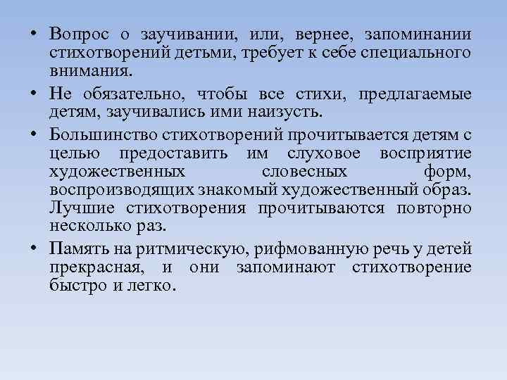 • Вопрос о заучивании, или, вернее, запоминании стихотворений детьми, требует к себе специального внимания. • Не обязательно, чтобы все стихи, предлагаемые детям, заучивались ими наизусть. • Большинство стихотворений прочитывается детям с целью предоставить им слуховое восприятие художественных словесных форм, воспроизводящих знакомый художественный образ. Лучшие стихотворения прочитываются повторно несколько раз. • Память на ритмическую, рифмованную речь у детей прекрасная, и они запоминают стихотворение быстро и легко.