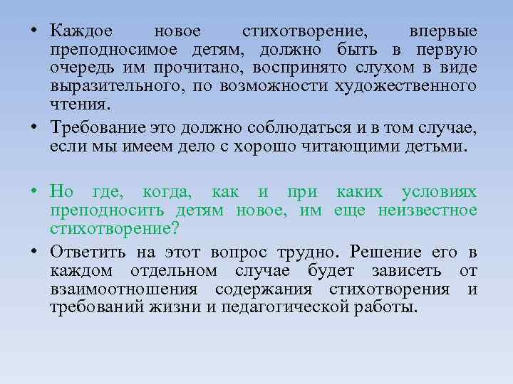 • Каждое новое стихотворение, впервые преподносимое детям, должно быть в первую очередь им прочитано, воспринято слухом в виде выразительного, по возможности художественного чтения. • Требование это должно соблюдаться и в том случае, если мы имеем дело с хорошо читающими детьми. • Но где, когда, как и при каких условиях преподносить детям новое, им еще неизвестное стихотворение? • Ответить на этот вопрос трудно. Решение его в каждом отдельном случае будет зависеть от взаимоотношения содержания стихотворения и требований жизни и педагогической работы.