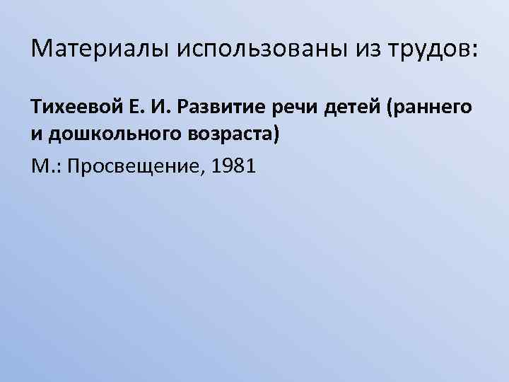 Материалы использованы из трудов: Тихеевой Е. И. Развитие речи детей (раннего и дошкольного возраста) М. : Просвещение, 1981