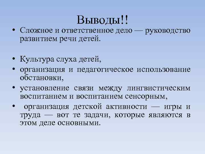 Выводы!! • Сложное и ответственное дело — руководство развитием речи детей. • Культура слуха детей, • организация и педагогическое использование обстановки, • установление связи между лингвистическим воспитанием и воспитанием сенсорным, • организация детской активности — игры и труда — вот те задачи, которые являются в этом деле основными.