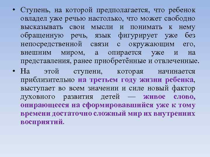 • Ступень, на которой предполагается, что ребенок овладел уже речью настолько, что может свободно высказывать свои мысли и понимать к нему обращенную речь, язык фигурирует уже без непосредственной связи с окружающим его, внешним миром, а опирается уже и на представления, ранее приобретённые и отвлеченные. • На этой ступени, которая начинается приблизительно на третьем году жизни ребенка, выступает во всем значении и силе новый фактор духовного развития детей — живое слово, опирающееся на сформировавшийся уже к тому времени достаточно сложный мир их внутренних восприятий.