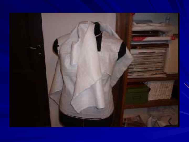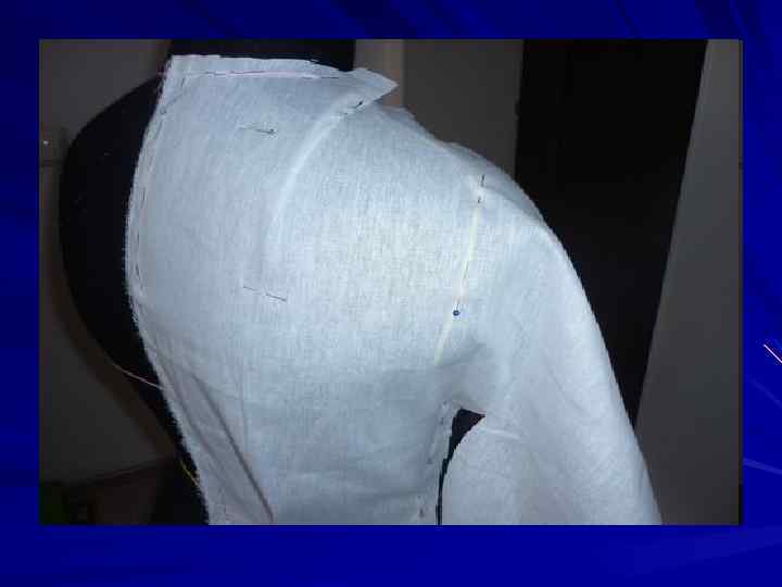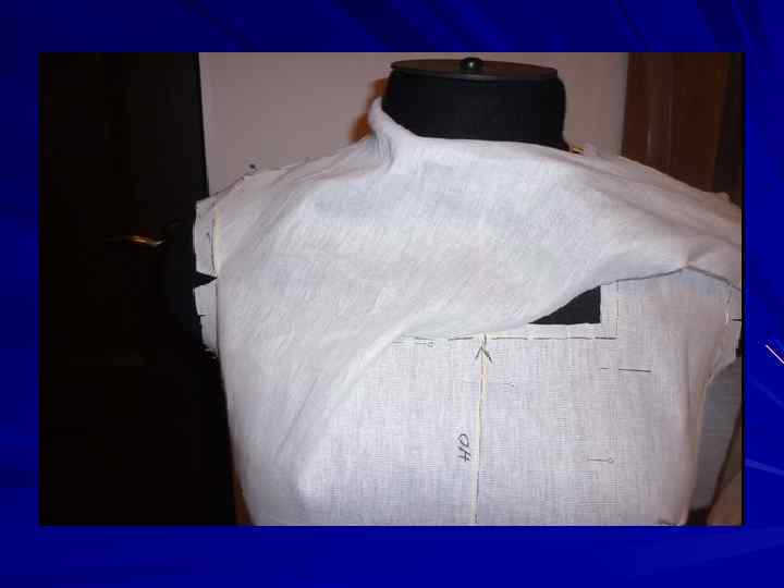 Поскольку основное движение ткани в процессе наколки будет на правой полочке, то на левой ткань закрепляем булавками, оформляем линию проймы, закладываем вытачку и оформляем линию левого бокового среза
