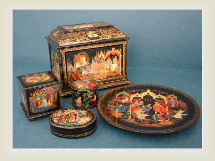 из папье-маше Шкатулки, ларцы, папиросницы стали прекрасной основой для миниатюрной темперной живописи, в которой Мстёрские мастера нашли новые возможности для развития своего искусства. Различные бытовые предметы из дерева, расписанные темперными красками и покрытые слоем лака: круглые плоские коробочки с орнаментом, лоток с лубочной сценкой, сосуды с крышками (так называемые кубышки). Изображение святой троицы или скачущих на лошадях волхвов, помещенные на закругленных стенках сосудов, вызывают невольное удивление.