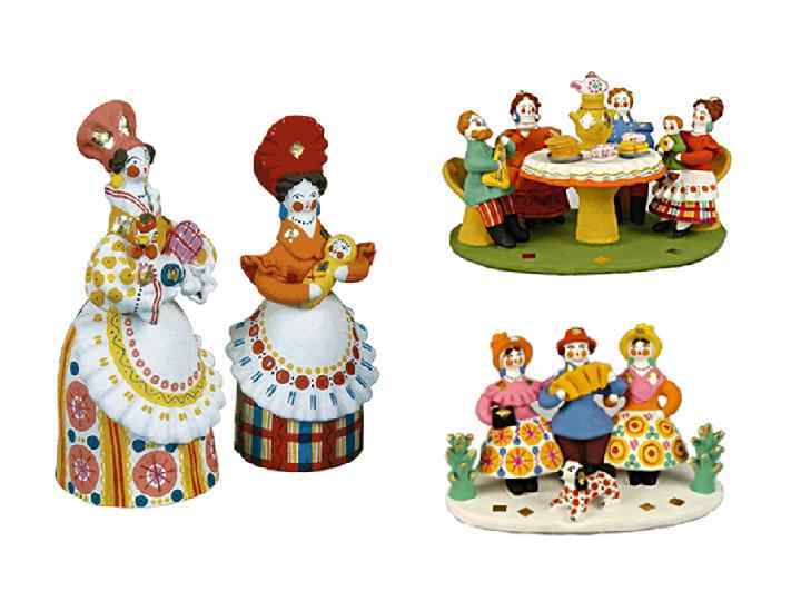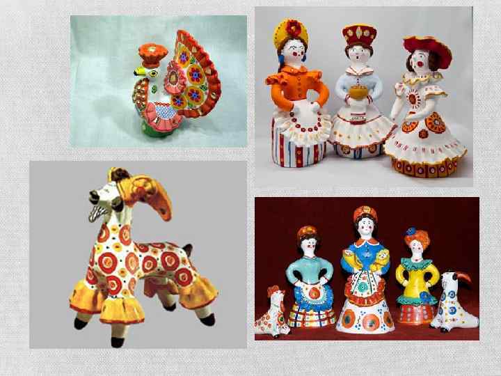ДЫМКОВСКИЕ ИГРУШКИ Дымковская игрушка – оригинальный глиняный промысел, зародившийся и сохранившийся исключительно на территории Вятского края (Кировской области), в слободе Дымково, где издавна селились печники и гончары. Мало какой другой регион России имеет столь яркий и самобытный символ, какой имеет Вятский край в виде дымковской игрушки. В прошлом изготовление дымковской игрушки было семейным промыслом. В летние месяцы заготавливали глину, толкли вручную или растирали в краскотерках комовой мел, в остальное время - лепили, сушили, обжигали изделия, белили мелом, разведенным на снятом коровьем молоке, красили яичными красками, украшали ромбиками золотистой потали. А весной на лодках привозили дымковскую игрушку в город на праздник, радуя своим искусством детей и взрослых.