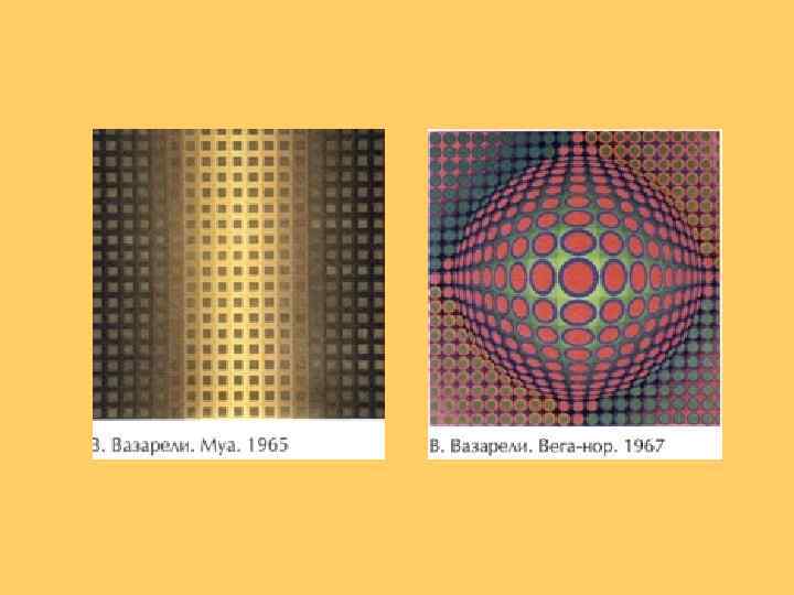 Авангард Оп арт – (англ. optical art оптическое искусство) направление в искусстве, использующее различные зрительные иллюзии, основанные на особенностях восприятия плоских и пространственных фигур. Оп арт зародился в 1950 е гг. внутри абстракционизма, продолжив геометрическую абстракцию. Основоположник французский художник венгерского происхождения Виктор Вазарели Представители – Бриджит Рили, Лари Пунз, Ричард Анушкевич, Хесус Рафаэль Сото