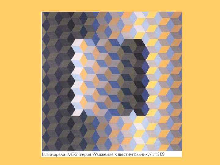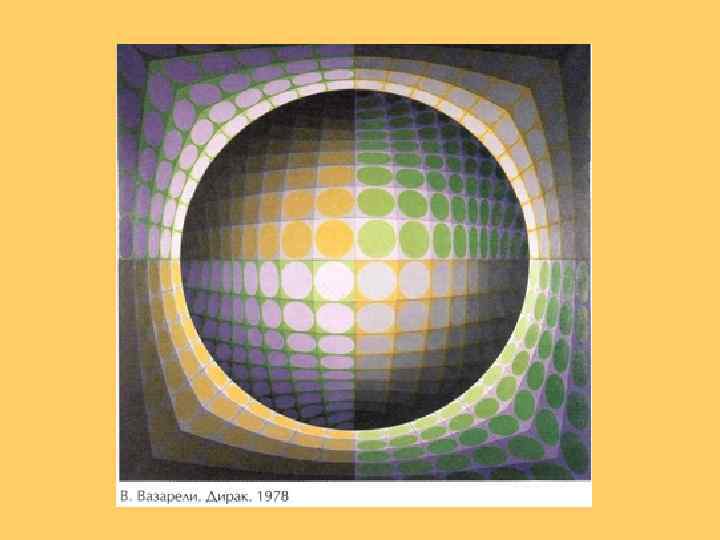 Оп арт Художественные приемы и формы выражения: • Основа художественно организованные оптические эффекты (пространственного перемещения, парения, слияния форм), которые • Геометризированные комбинации линий и пятен с введением резких цветовых и тональных контрастов, ритмических повторов, пересечением спиралевидных и решетчатых конфигураций; • Применение зеркал, линз, металлических пластинок и проволок, установок меняющегося света для усиления эффекта воздействия и создания особой эстетической среды; • Иллюзия движения, вспышек света, меняющейся формы и последовательной смены образов присутствуя только в ощущениях зрителя.