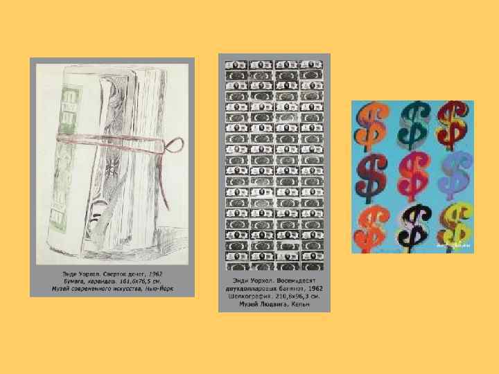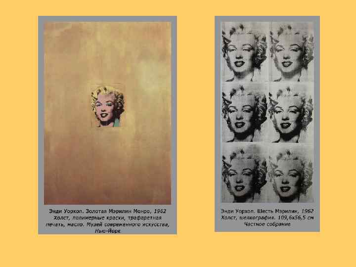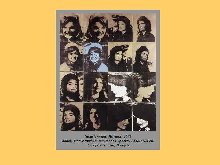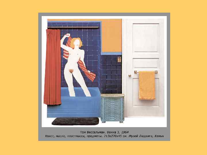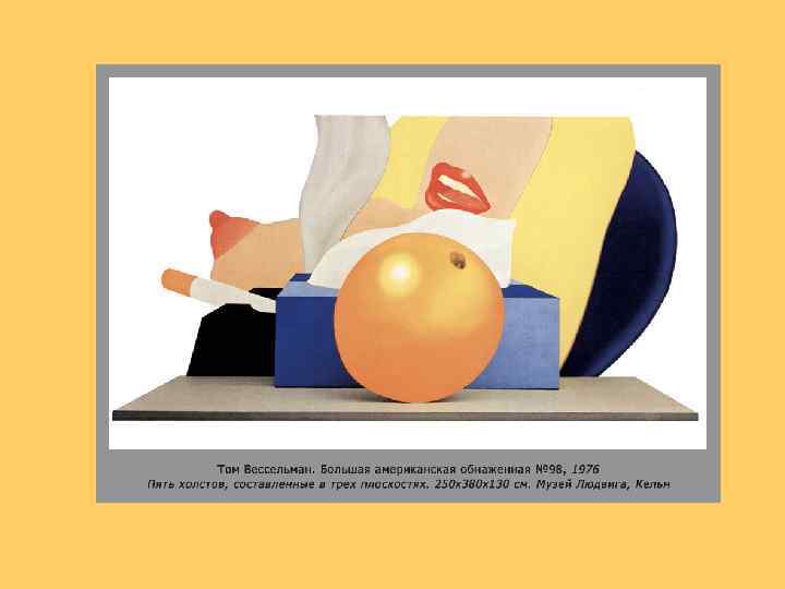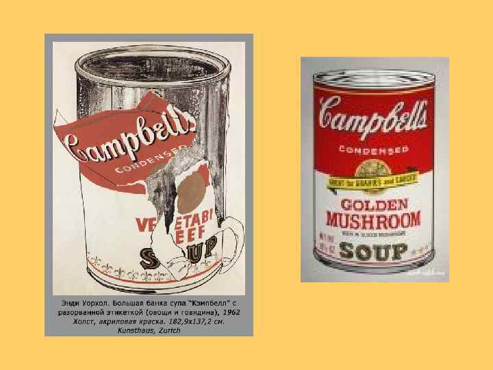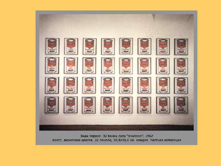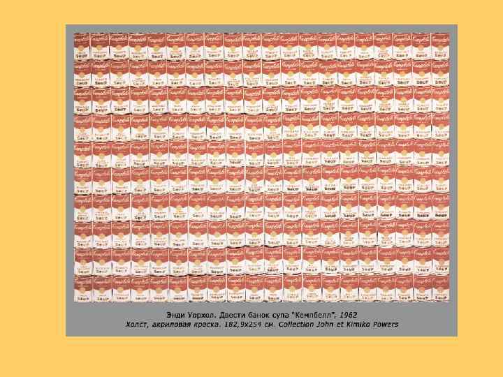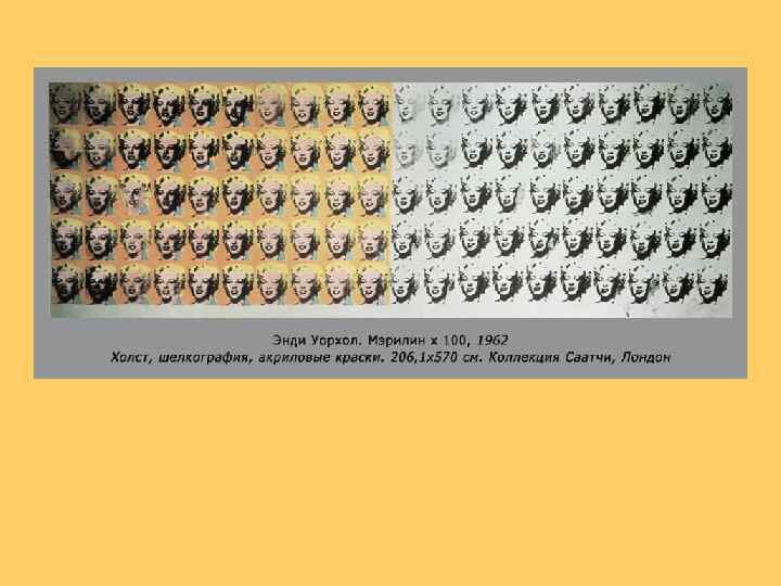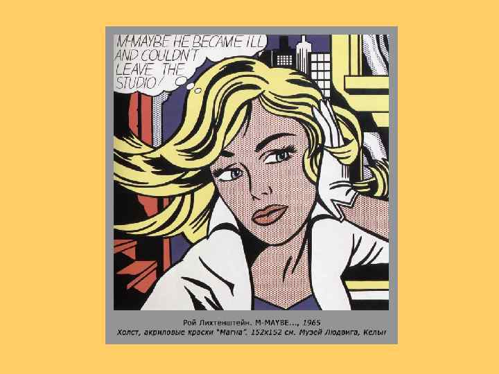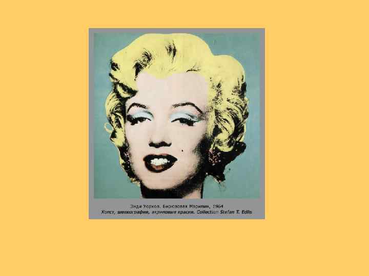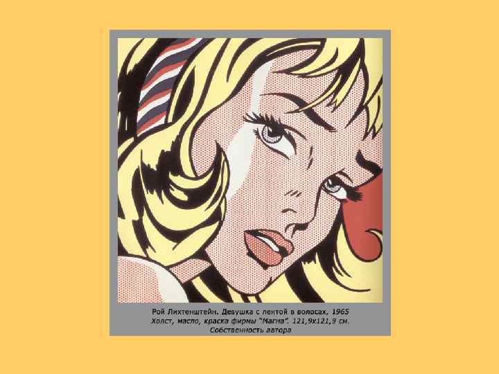 Поп арт Художественные приемы и формы выражения: - Обращение к реальности и раскрытие эстетической ценности образцов поп культуры; - Использование образов рекламы, стереотипов и символов масс медиа; - Приемы цитирования, коллажа, тиражирование; - Демифологизация образов; - Ирония, игровое начало; - Объекты: комиксы, картинки из журналов, рекламные образы, предметы потребления; - Технологии: аэрограф, шелкография, трафарет, имитация материалов, акриловые краски