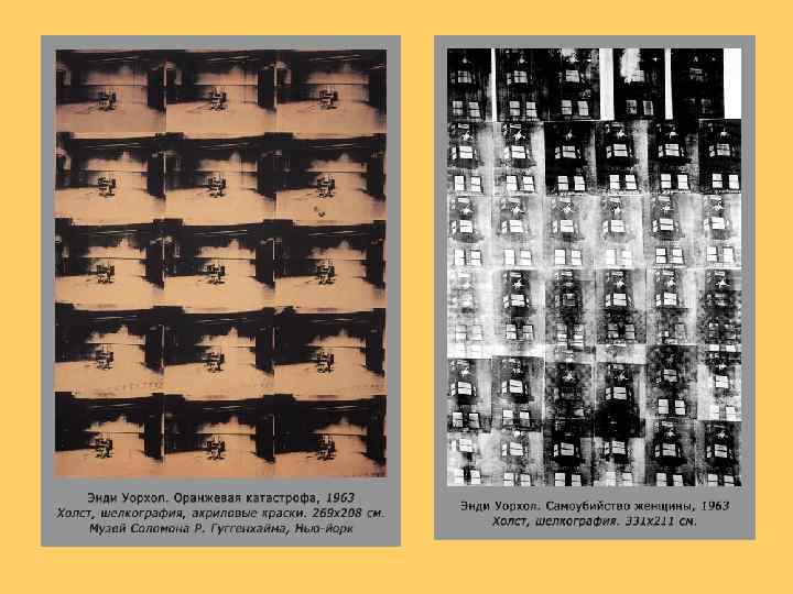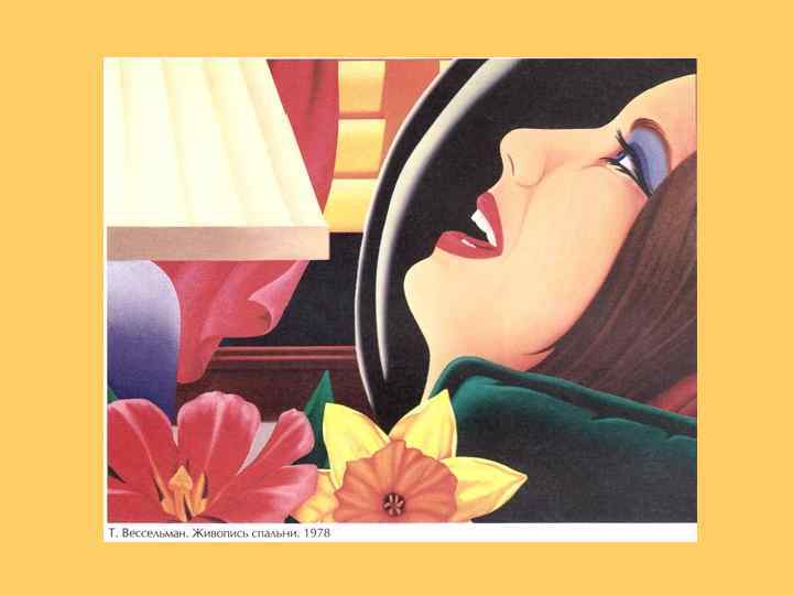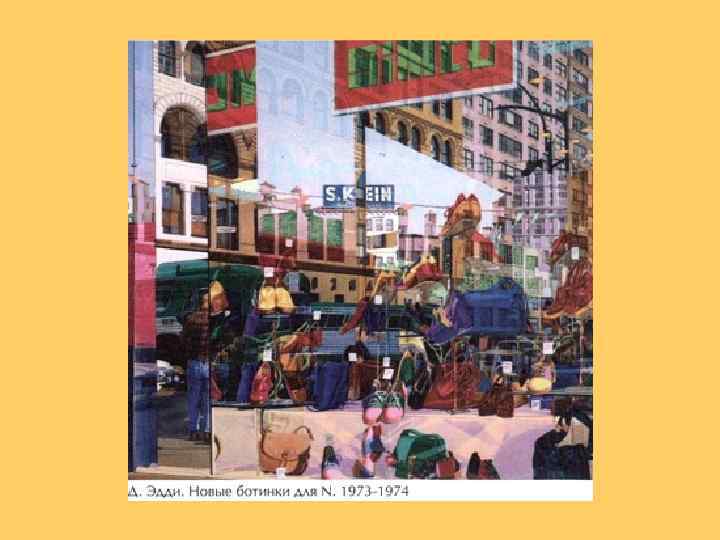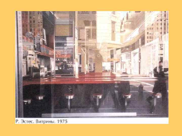 Гиперреализм Художественные приемы и формы выражения Произведения детально копированные фотокартины; Сохранялись все особенности фотоизображения, для чего использовались механические приемы копирования: диапроекция, аэрограф, эмульсионное покрытие и т. д. Механистичность произведений, давала эффект устранение из процесса создания человека Образ реальности, чаще отраженной своей множественностью в стеклянных витринах магазинов, в полированных кузовах автомобилей… Цель изображение повседневных реалий; главные темы обезличенная механизированная жизнь современного города; сюжеты нарочито банальны, а образы подчеркнуто «объективны» (автомобили, жилые дома, рестораны, рекламные щиты бензоколонки, телефонные будки, и редко живые люди «персонажи с улицы» ).