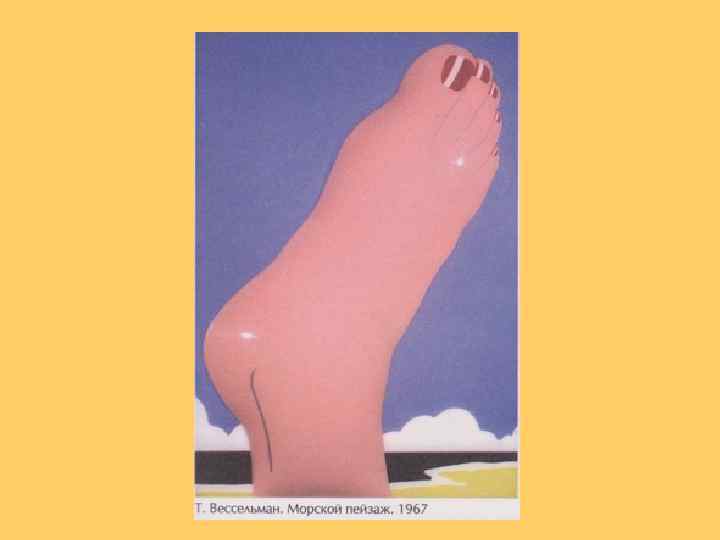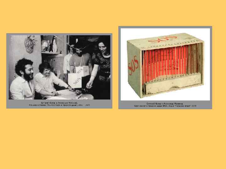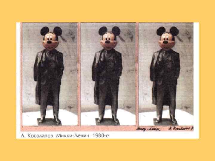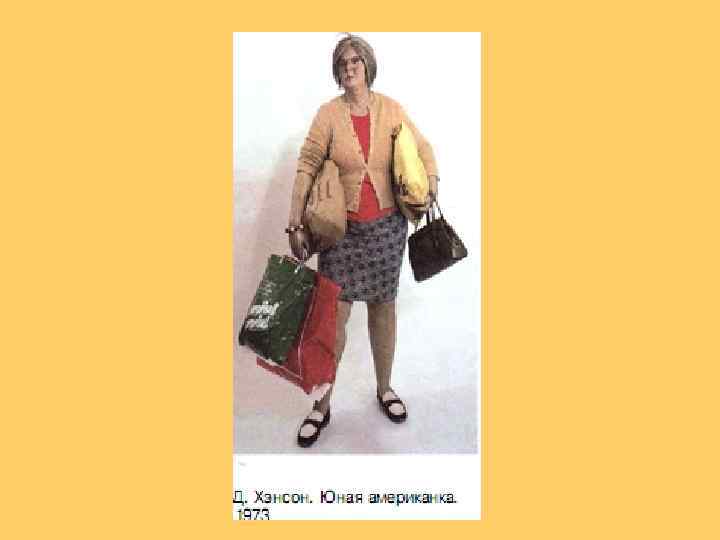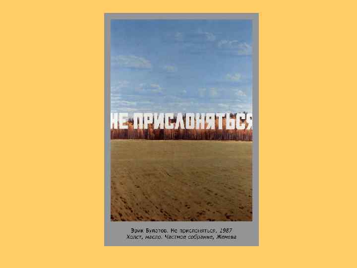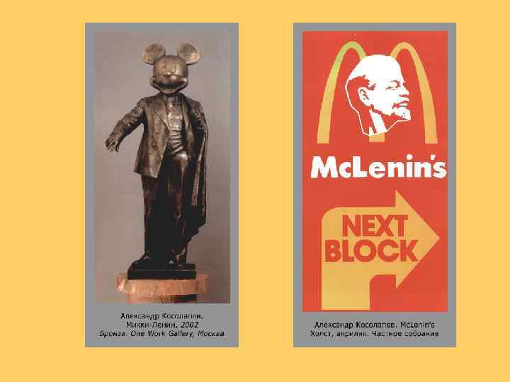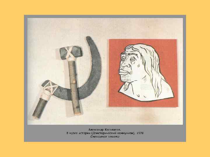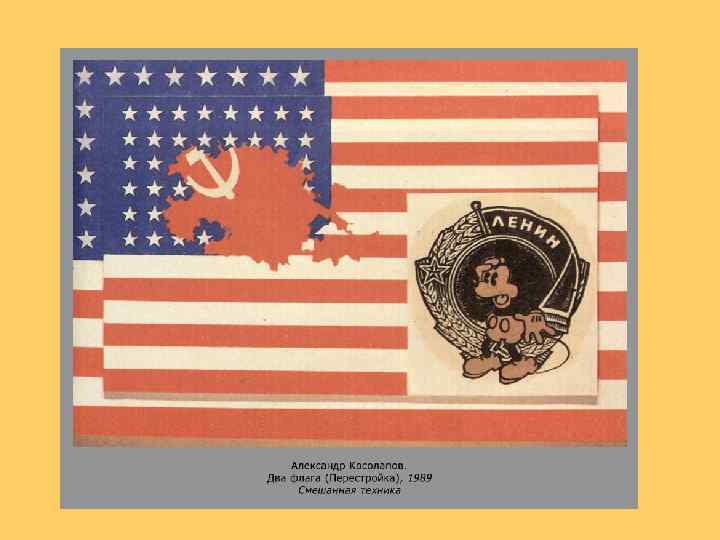 Соц арт Художественные приемы и формы выражения • господство вещевого фетишизма в капиталистическом обществе перекликалось с засильем советского идейного мифотворчества. • Обращение и переработка клише, символов и форм, расхожих мотивов советской политической агитации; • Использование игры, эпатажа для раскрепощения зрителя от идеологических стереотипов. • объекты художественные коллажи, «цитирующие» советский официоз с использованием в произведениях реальных вещей и бытовых предметов. • Ирония, гротеск, острая подмена, свободное цитирование любых приемов и стилей, использование разнообразных форм (от станковой живописи до пространственных композиций)