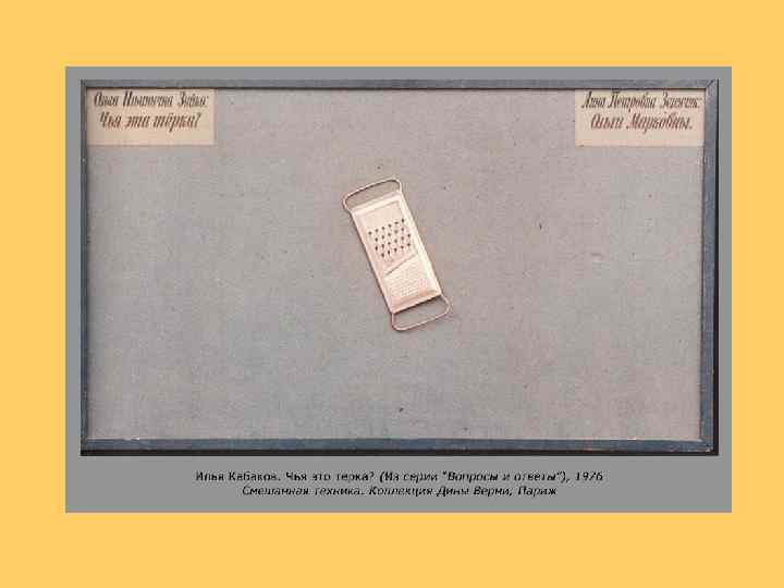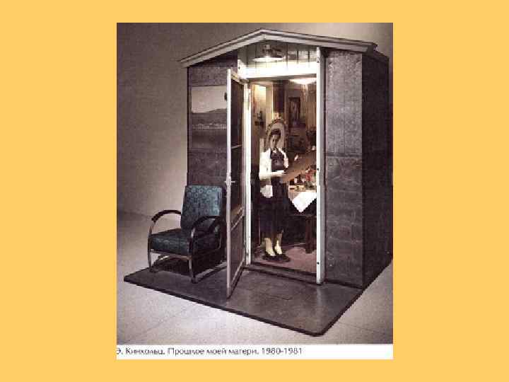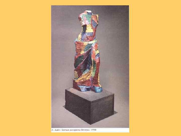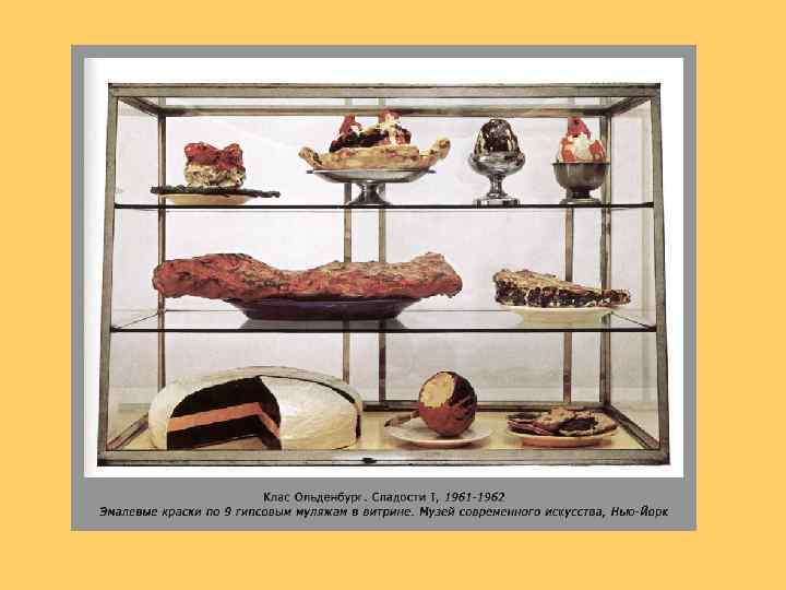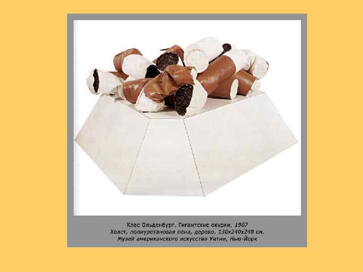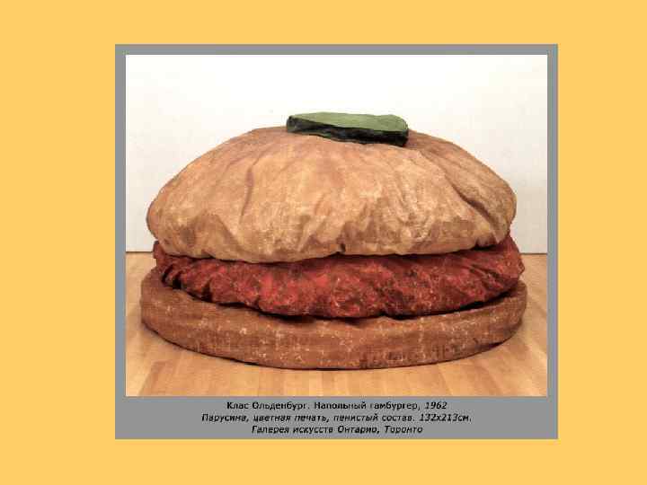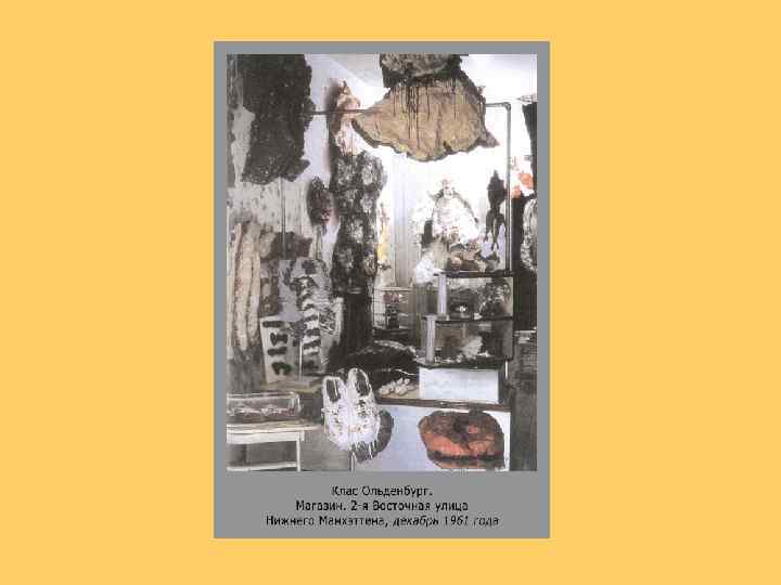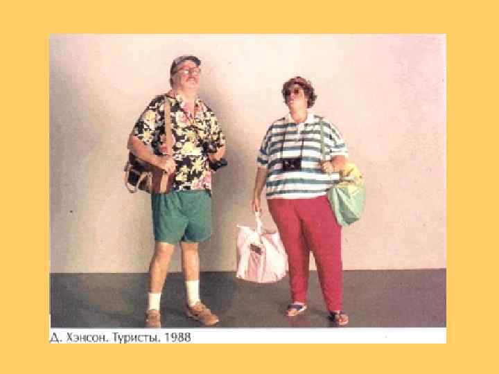 Соц арт Художественные приемы и формы выражения • господство вещевого фетишизма в капиталистическом обществе перекликалось с засильем советского идейного мифотворчества. • Обращение и переработка клише, символов и форм, расхожих мотивов советской политической агитации; • Использование игры, эпатажа для раскрепощения зрителя от идеологических стереотипов. • объекты художественные коллажи, «цитирующие» советский официоз с использованием в произведениях реальных вещей и бытовых предметов. • Ирония, гротеск, острая подмена, свободное цитирование любых приемов и стилей, использование разнообразных форм (от станковой живописи до пространственных композиций)