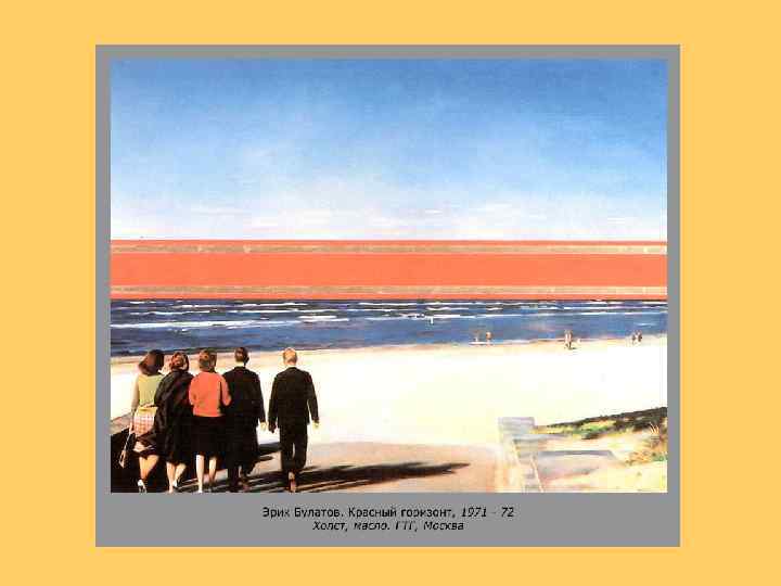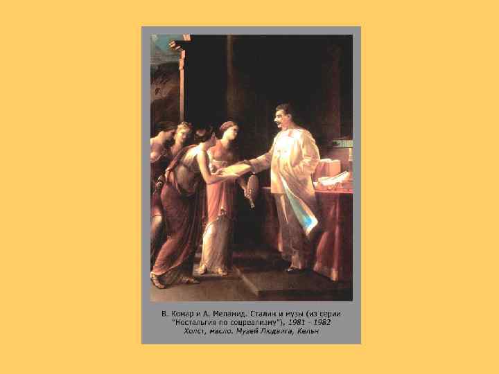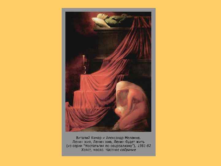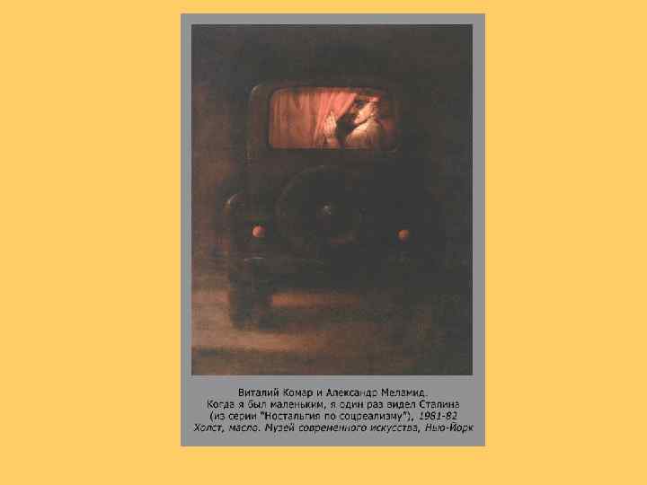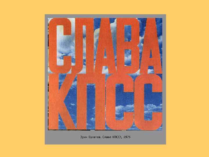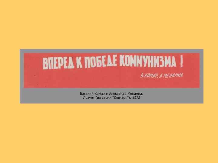 Авангард Соц арт – одно из направлений постмодернистского искусства, сложившееся в СССР в 1960 1970 х гг. в рамках так наз. альтернативной культуры, противостоящей государственной идеологии. Возник как пародия на официальное советское искусство и образы современной массовой культуры в целом, что нашло отражение в его ироничном наименовании, соединившем понятие соц реализма с поп артом. Основоположники – Виталий Комар, Александр Меламид Представители – Эрик Булатов, Борис Турецкий, Александр Косолапов, Леонид Соков, Борис Орлов, Ростислав Лебедев